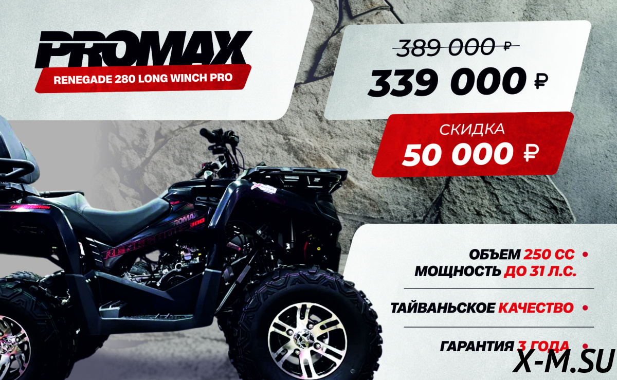 Квадрик просто пушка! PROMAX RENEGADE 280 LONG WINCH PRO реально тащит. Двигло мощное, 25 л.с. – это вам не шутки. Вариатор Malossi – зверь! Лебедка PRO-LINE – удобно. Оптика от SEOUL SEMICONDUCTOR – светит как надо. В общем, квадрик топ, всем советую. Особенно понравился спортивный выхлоп AKRAPOVICH – звучит круто!